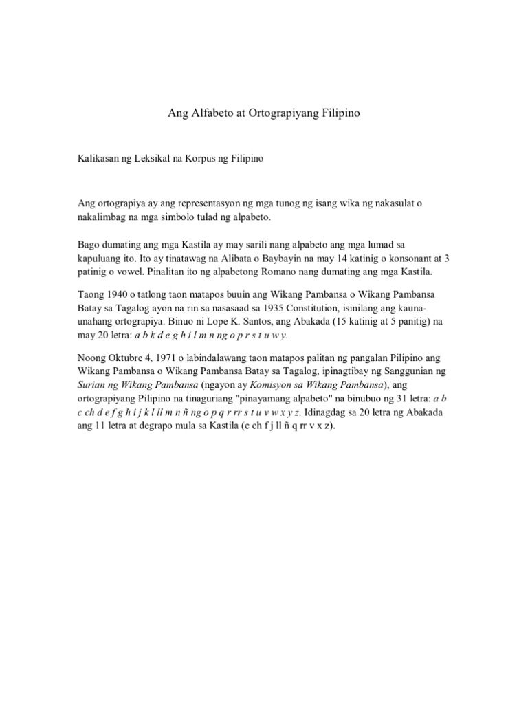 Anong taon na palitan ang alpabitong filipino. Bago ito nagkaroon ng tatlong saligang batas na opisyal na kinikilala ng mga eksperto. Each letter is accompanied by an illustration of an object or person whose name begins with or has the letter. C Ano ang bumubuo sa Alpabetong Filipino.