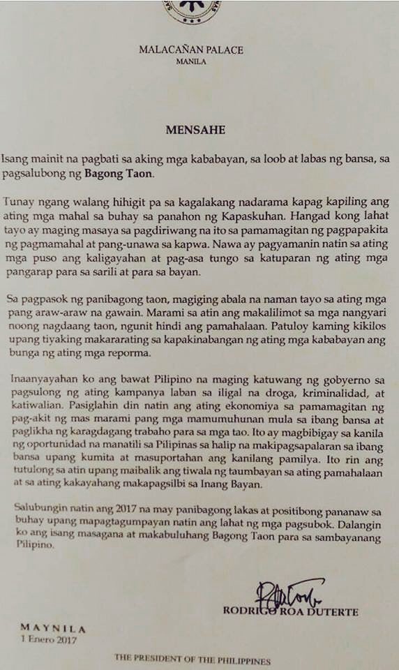 It is the time when we all want to start on a good note. Sa kabila ng ito sinikap nating ipagdiwang at lasapin ang mensahe ng Pasko- na ang atin Manububos si Hesus ay isinilang para maging kapiling natin ang Diyos. Sa pagsisimula ng taong 2017 ang mga Pilipino ay puno ng pag-asa para sa pagbabago.