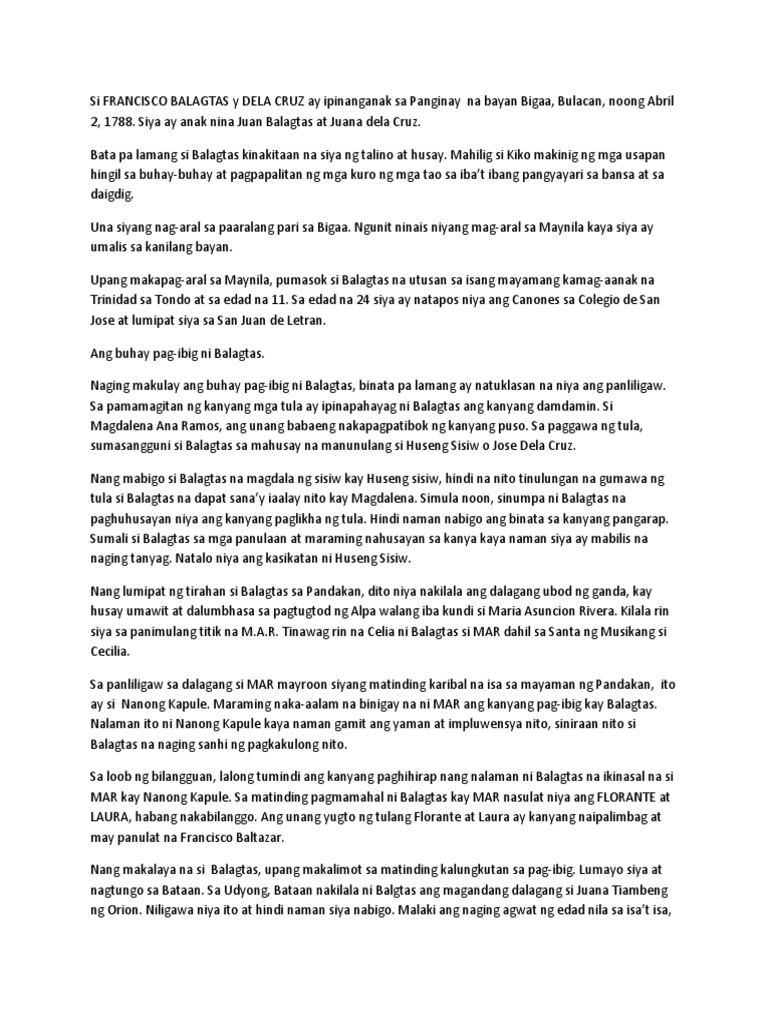 LOVE makes you crazy for no reason but it makes you cry to teach you a lesson pa helphindi po ito module lang Performance. Talambuhay ni Balagtas Unang mga taon Si Francisco Balagtas Baltazar ay ipinanganak noong 02 Abril 1788 sa Panginay Biguaa ngayon ay Balagtas Bulacan. Francisco Balagtas y de la Cruz April 2 1788 February 20 1862 commonly known as Francisco Balagtas and also as Francisco Baltazar was a prominent Filipino poet during the Spanish colonial period of the PhilippinesHe is widely considered one of the greatest Filipino literary laureates for his impact on Filipino literature.