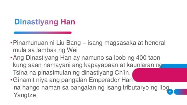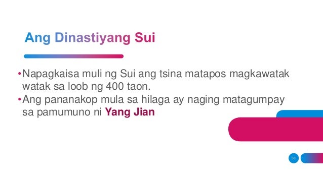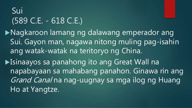 Ang Dinastiyang Sui ay pinamunuan ni Yang ChienPinalakas niya ang depensa sa hilaga laban sa mga turko gamit ang pagpapaayos ng Great Wall. Dinastiyang han slideshare by. Ipinagawa ni Weng Ti ang isang mahabang kanal na nag-uugnay sa hilaga at timog Tsina.
