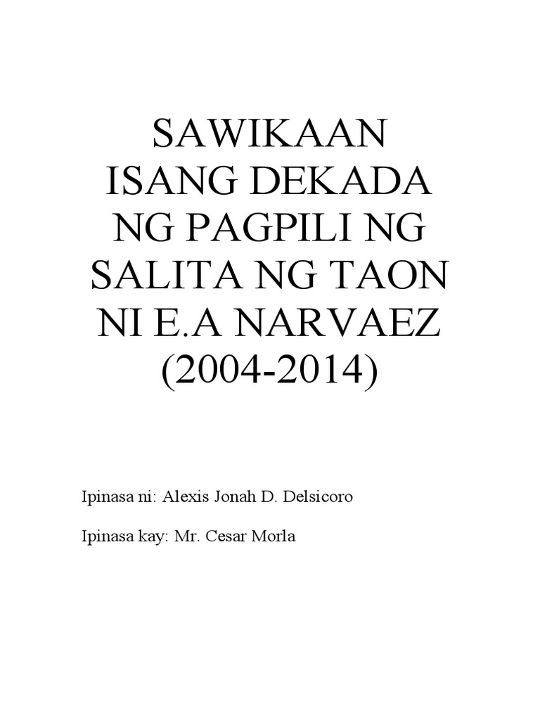 Sawikaan isang dekada ng pagpili ng salita ng taon. Zapra 2005 viii ang Sawikaan ay isang masinsinang talakayan para piliin ang pinakanatatanging salitang namayani sa diskurso ng. ANG PAMANTAYAN SA PAGPILI NG SALITA NG TAON 1 kabuluhan ng salita sa buhay nating mga Filipino ato pagsalamin nito ng katotohanan o bagong pangyayari sa ating lipunan.